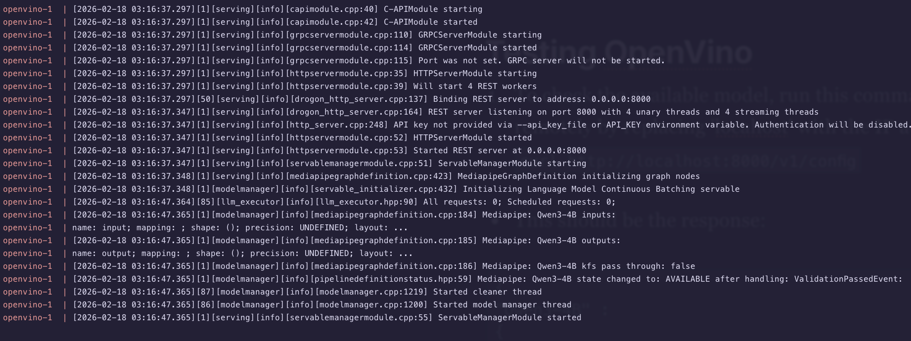 Since OpenVino seems like it is working, lets test the API endpoints locally before we add those APIs to an application like Karakeep.