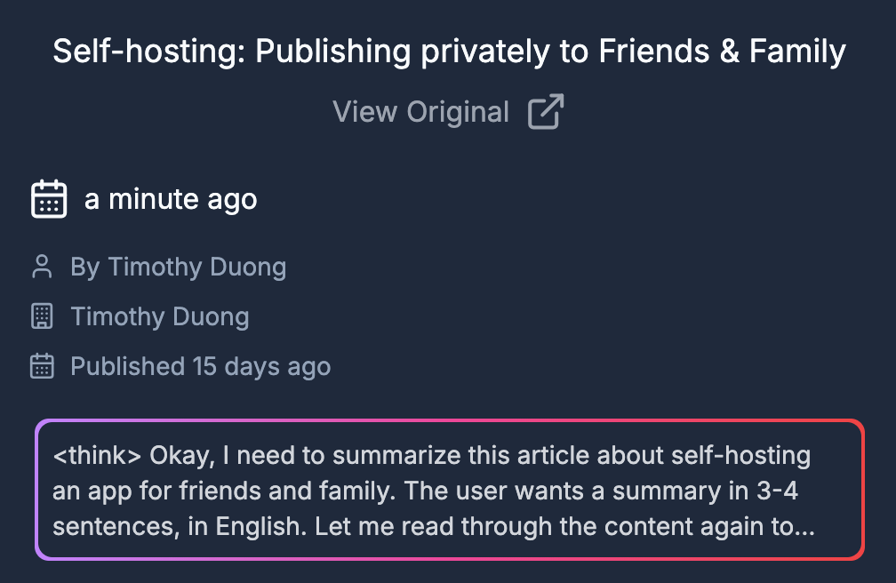 - I tested Karakeep's AI Summarisation and kept the <Thinking> tags but I'm fine with that, I only use Karakeep's AI Tagging.