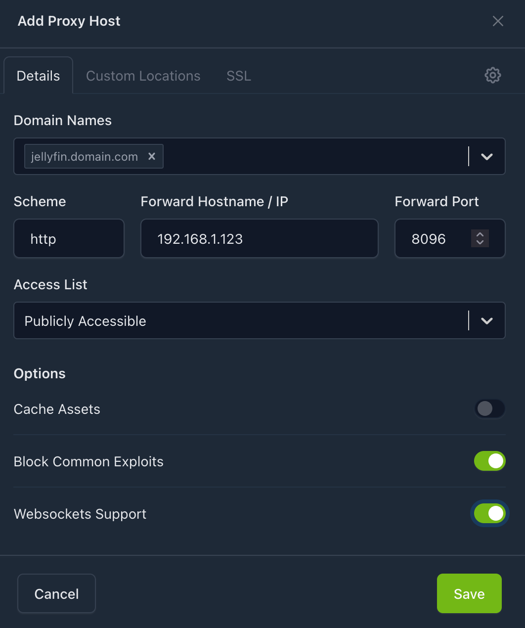 3. Forward hostname / IP: 192.168.1.123 (*jellyfin local IP address)
