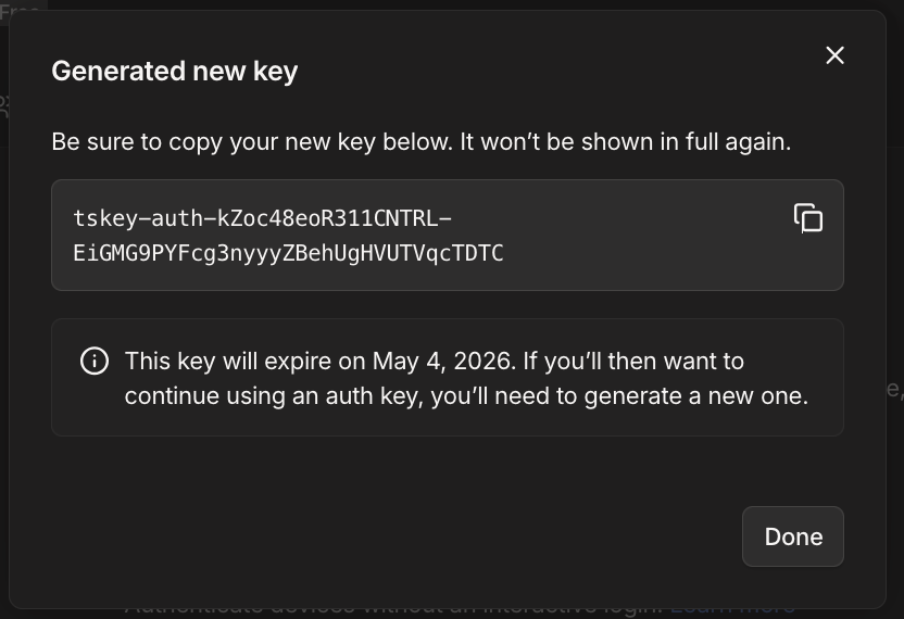 1. Select 'Generate Key' and copy the whole key e.g. tskey-auth-the-rest-of-the-key