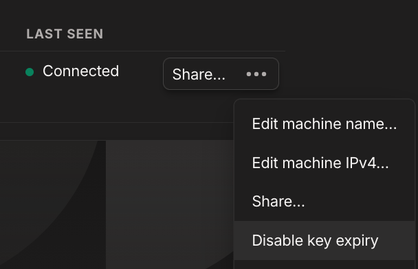 1. Select the three dots '...' and select 'Disable Key Expiry' to remove the need to re-authenticate the server / container every 90 days, otherwise, users will lose access
