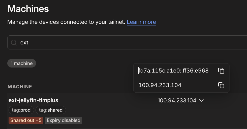 1. We will now need to add the Tailscale IP and associate it with your External DNS provider / Cloudflare DNS, this is optional but recommended. Locate the machine and under IP address to copy it to clipboard.