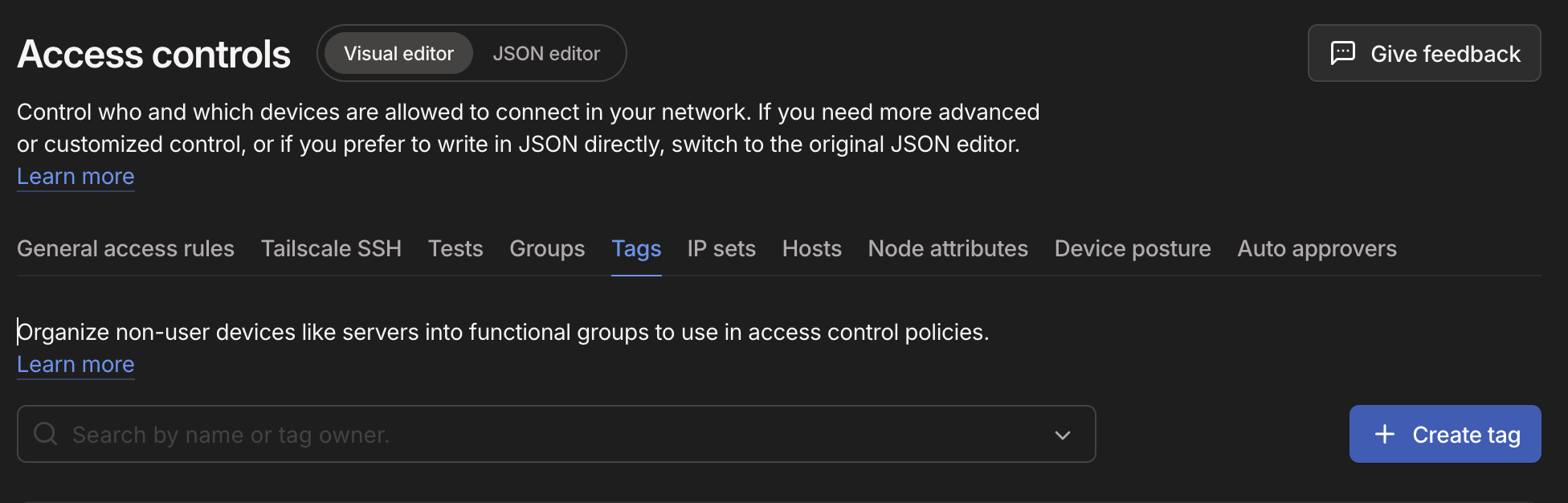 2. Once signed in, navigate to 'Tags': https://login.tailscale.com/admin/acls/visual/tags